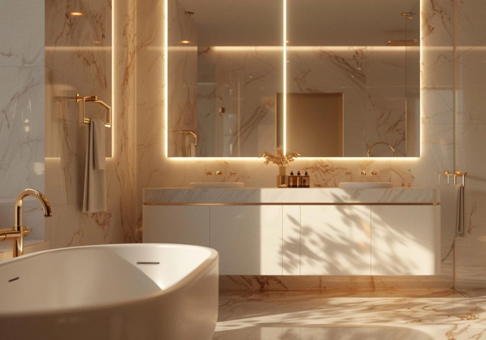 Hardware in brass or champagne gold softens the strong lines, while wall-mounted sinks with thin profiles enhance the sense of space. Lighting plays a key role here; under-vanity LEDs or a floating vanity design highlight the floor’s pattern and give it a sense of lift.