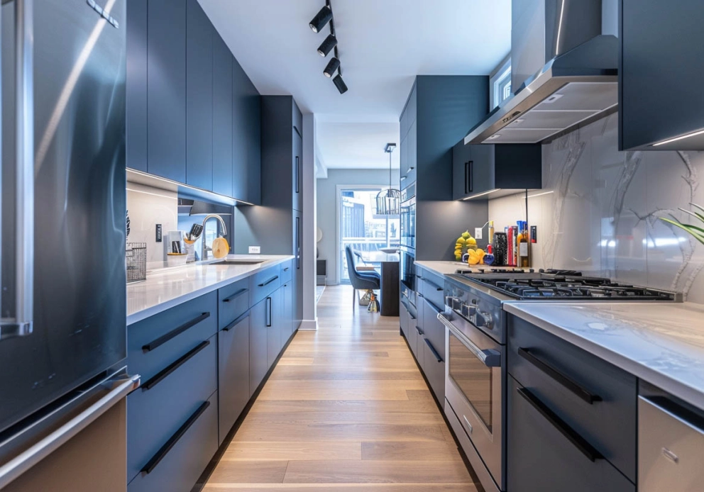 Narrow galley kitchens benefit from RTA inset door kitchen cabinets ensure functionality in narrow spaces. Pantry units should be placed at the ends of the kitchen or along one side to allow light to enter and view to remain unobstructed.
