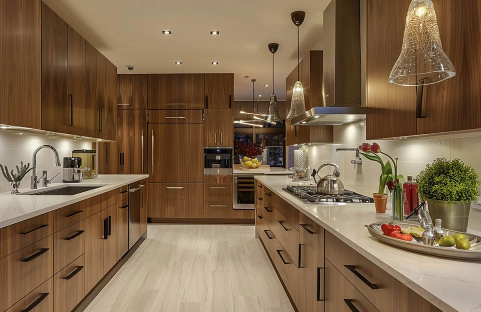 The U-shaped design is best for larger suburban homes. To create an ergonomic work triangle, place the stove in the middle run. Pantry cabinets can be placed on one end to provide enough storage.